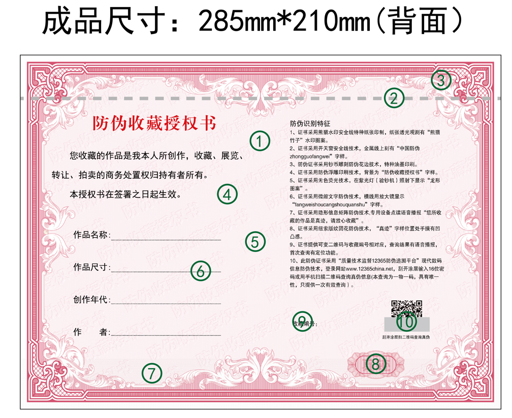 4、证书采用防伪浮雕印刷技术,背量为“防伪收藏授权书”字样。